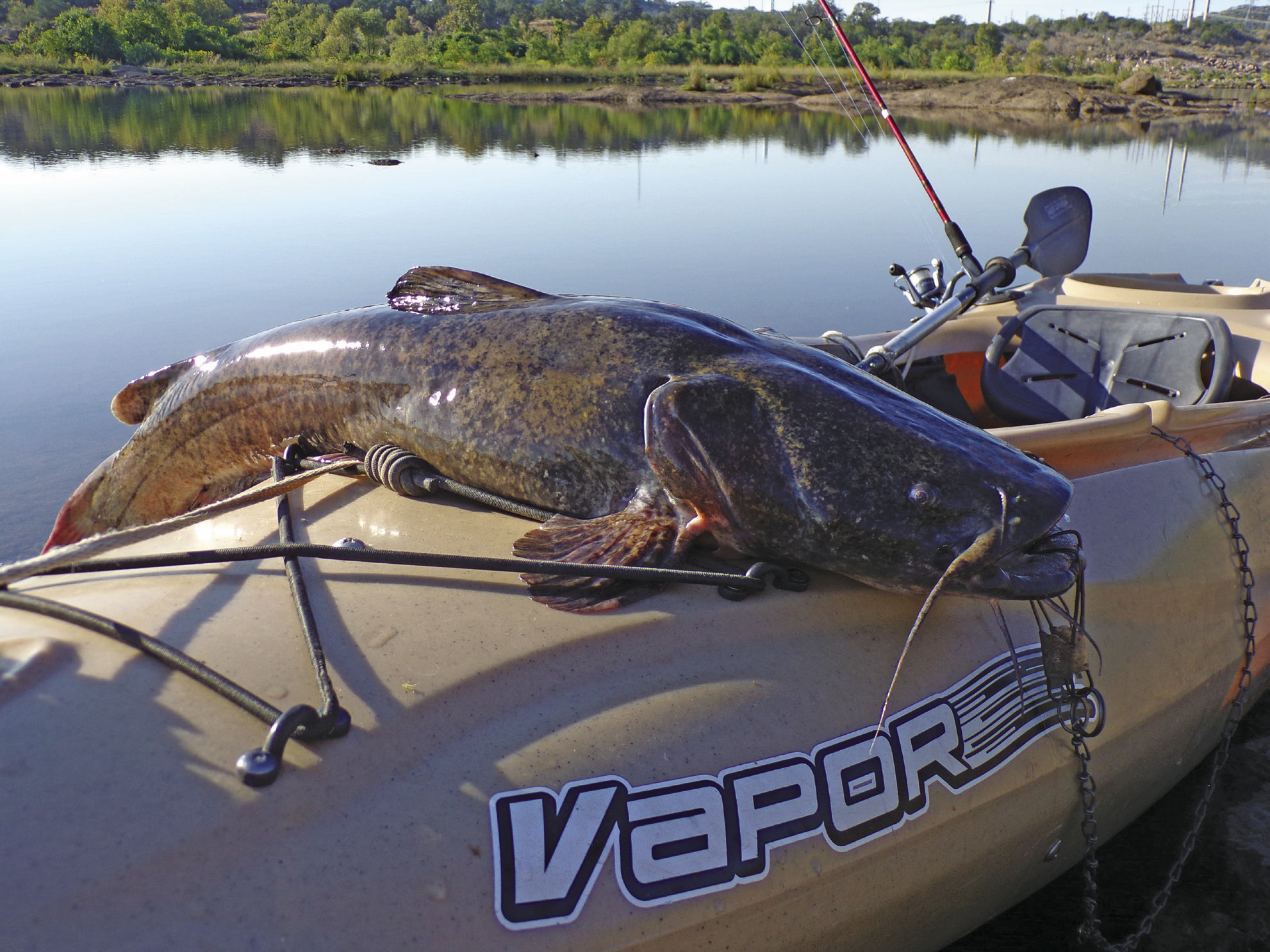 After a 30-minute fight, he pulled the large yellow catfish towards the kayak and placed it on a stringer.