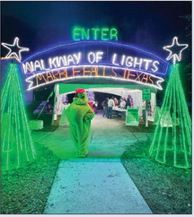 The Marble Falls Walkway of Lights is glowing strong each night through Jan. 3. Pictured above, even the Grinch welcomed revelers recently. Below, Marble Falls/Lake LBJ Chamber Executive Director Kim Kankel visited the display with a fairfeathered friend. Visit marblefalls.org.