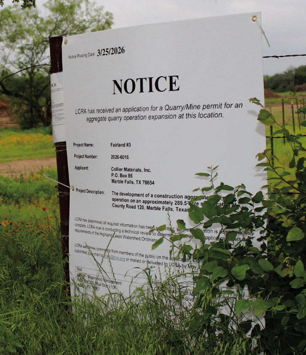 The acreage, northwest of Marble Falls, extends from the 7200 block at the railroad tracks westward to Gregory Lane. The planned mining pit would be located just east of another Collier mining pit as well as around the corner from two other pits, owned by the company, on CR 121.
